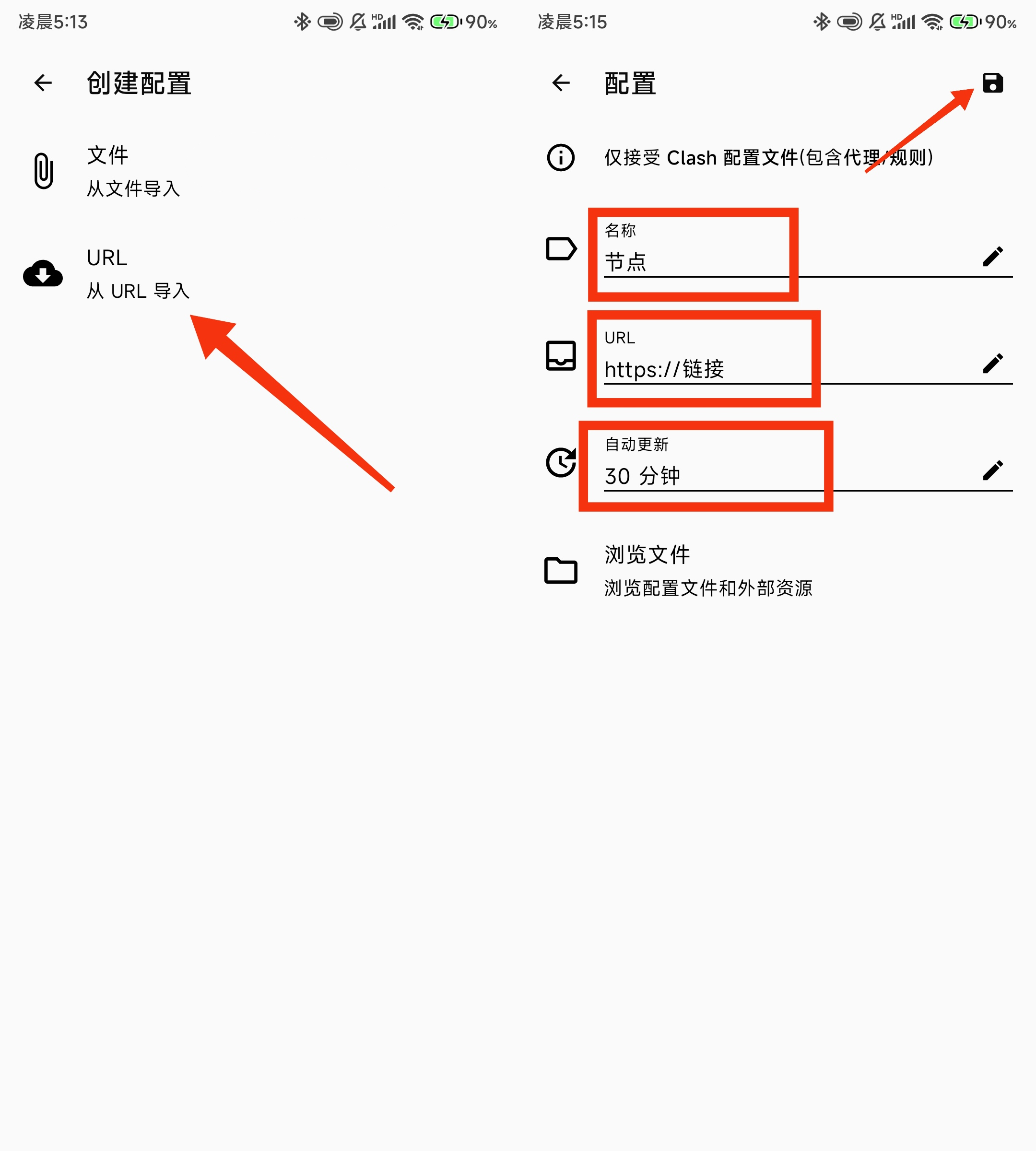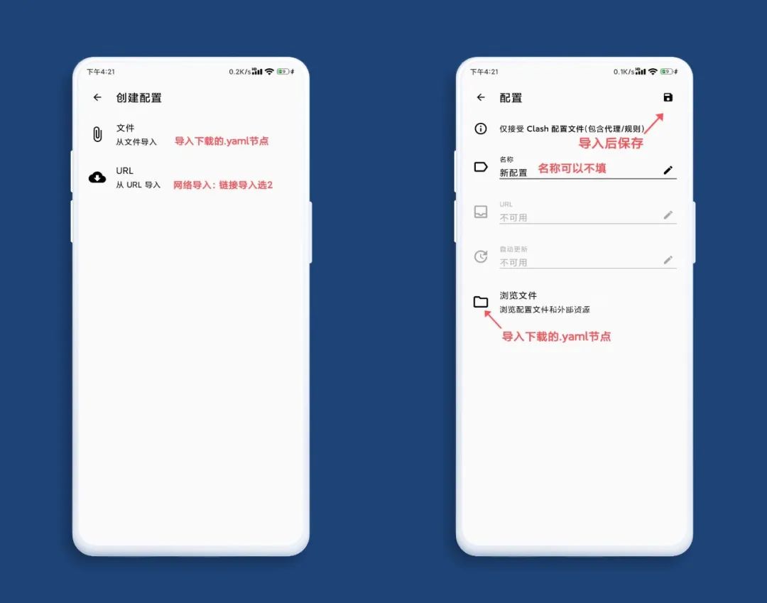 导入方式分为两种 订阅源链接(URL)和后缀.yaml 命名的文件。